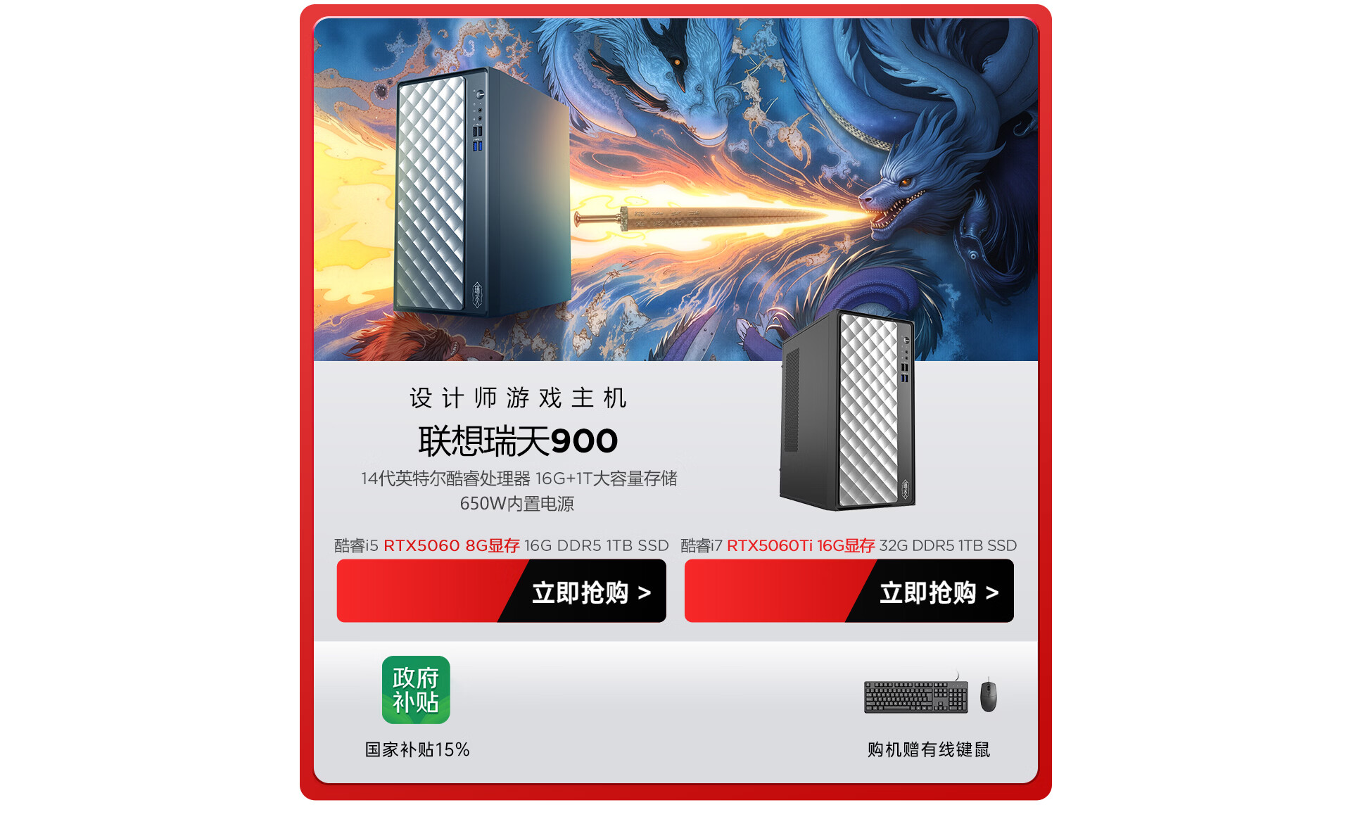 联想瑞天900 设计师台式电脑游戏主机(14代i5-14400 RTX5060 8G显卡 16G DDR5 1TB SSD Win11)国家补贴